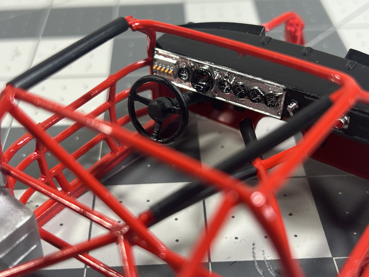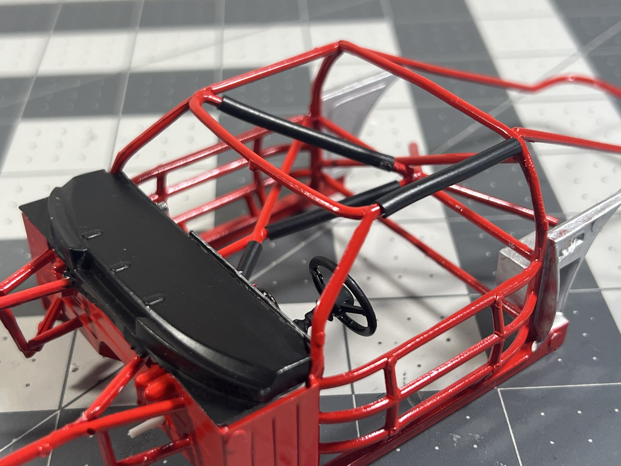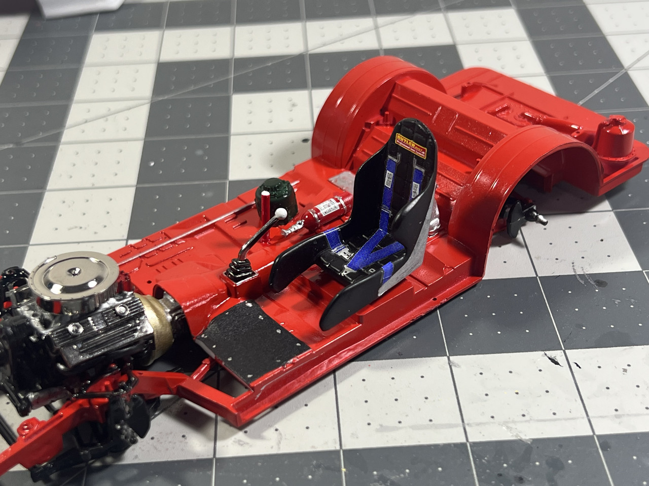 I got the chassis and the body finished up on the Red Roof Inns Monte Carlo.The seat is from a Monogram Lumina and I added roll bar padding(heat shrink tubing) and a dash panel,steering wheel and steering coulum from Jayes' Model Garage.I hope to have it finished up soon.