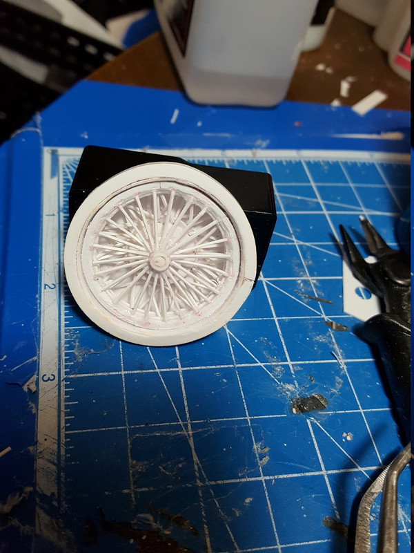 Got the left rear wheel spoking completed. Need to add the knock off and some putty to smooth it for painting.