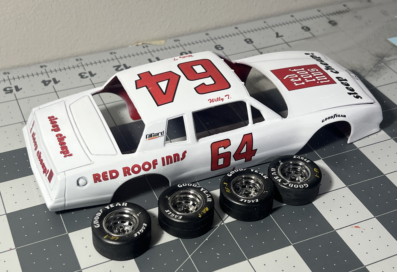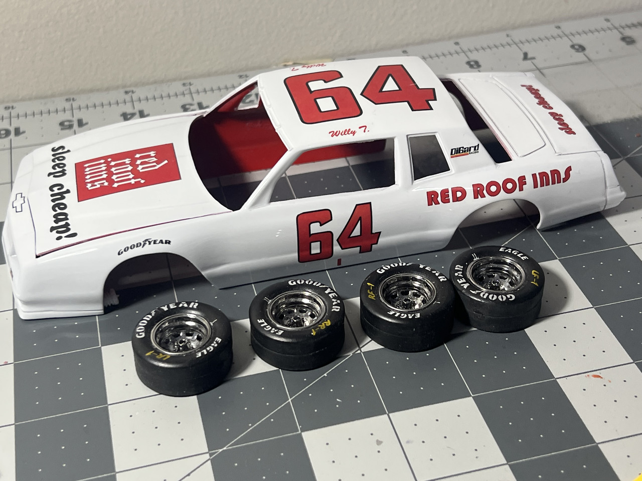 I was finally able to finish up the bodywork on the #64 Red Roof Inns Monte Carlo.I think it's ready for paint.The chassis and the other parts of it(not shown)are painted Tamiya TS-8 Italian Red and cleared.I finished up the tires with Powerslide decals and used Tamiya smoke to tone the chrome wheels a bit.More updates soon🤞