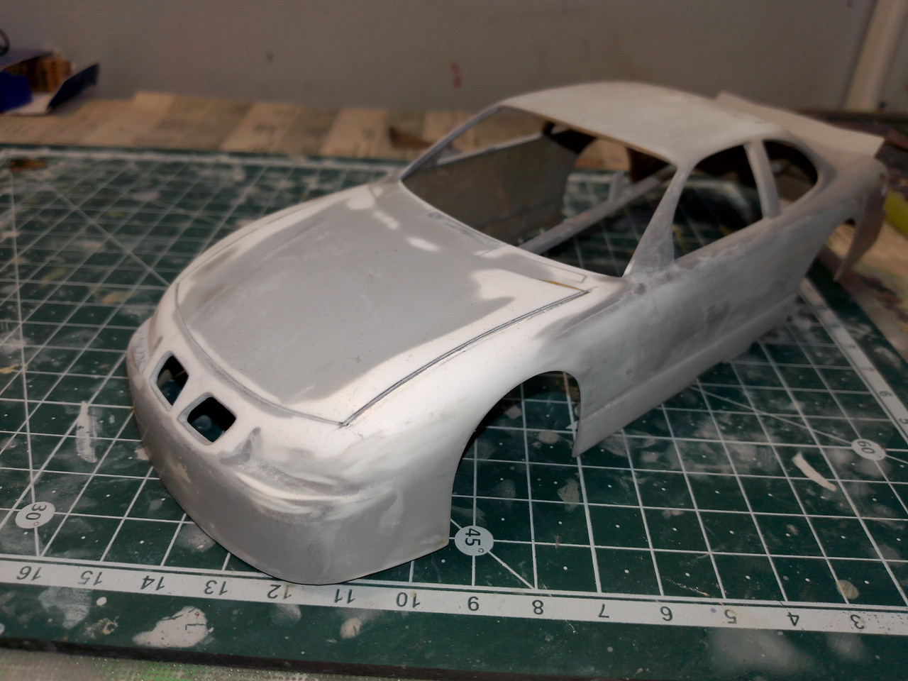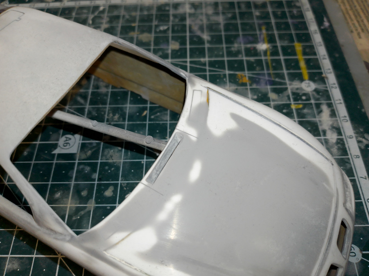 And the Pontiac, not been painted, but I did step on the hood,(!) deforming it. So it's been glued in and panel lines puttied over. Am working on a template to scribe the cowl panel line.