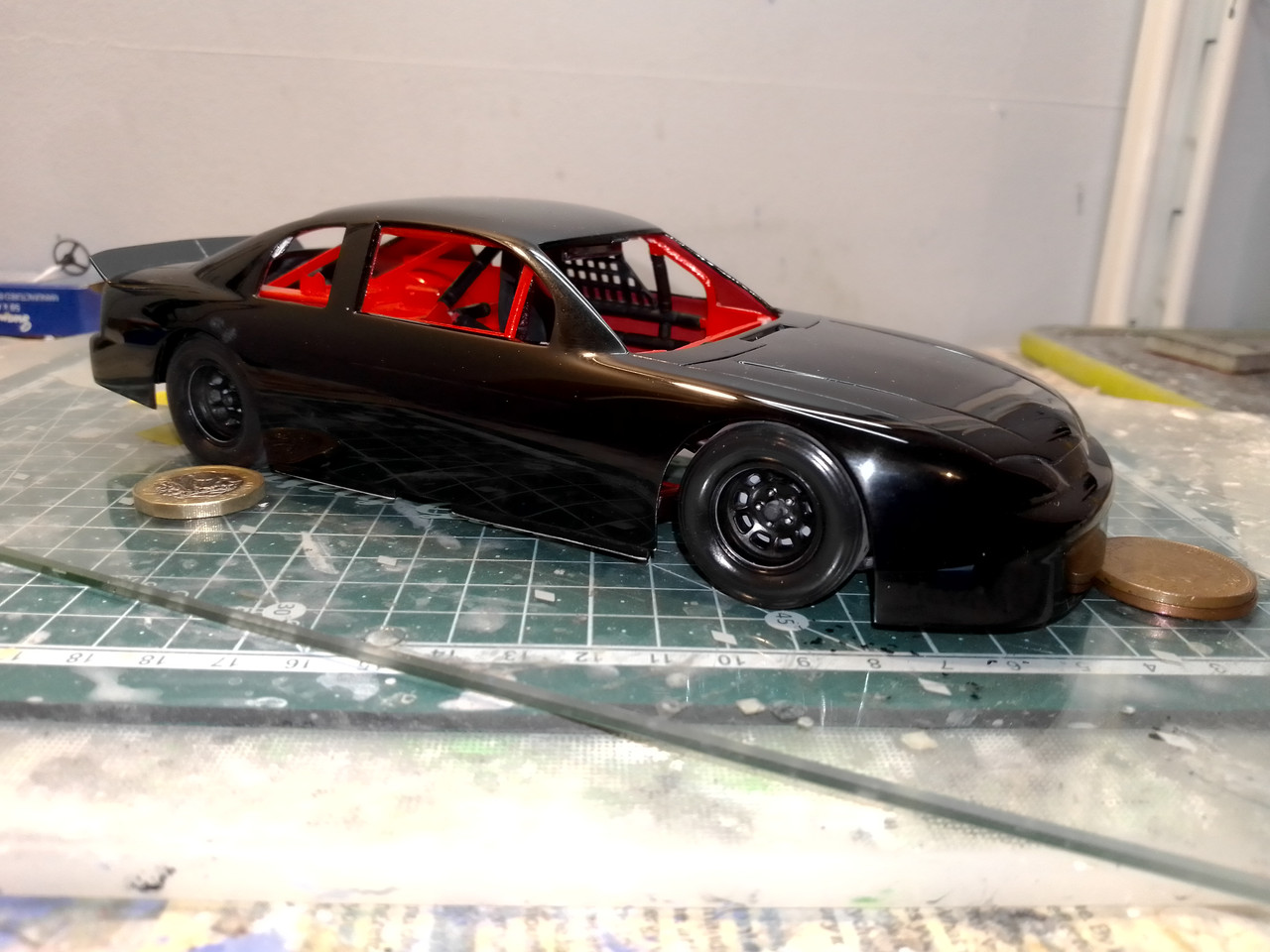 On the upside, I do have this successful Earnhardt build! Here I'm setting the wheels. A glass fridge shelf, so I can carry it all off my work bench.