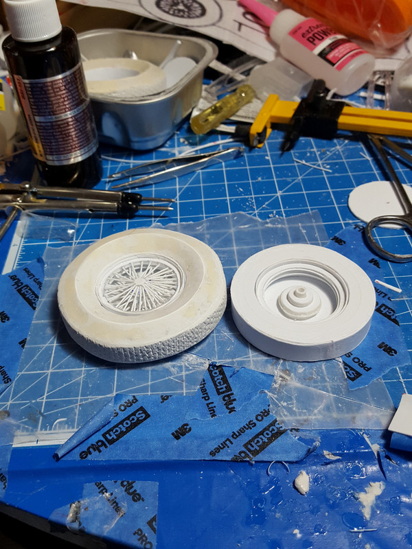 I got the first tire pretty much finished. Just needs to be primed and painted. I think it will look a lot better when it is flat black. The wheel for it still needs to be spoked and then also painted with Revell chrome. the second tire has the center strip installed and ready for epoxy putty so I can finish it before making the two front tires which will be smaller in both height and width. Also need to spoke the wheels for them.