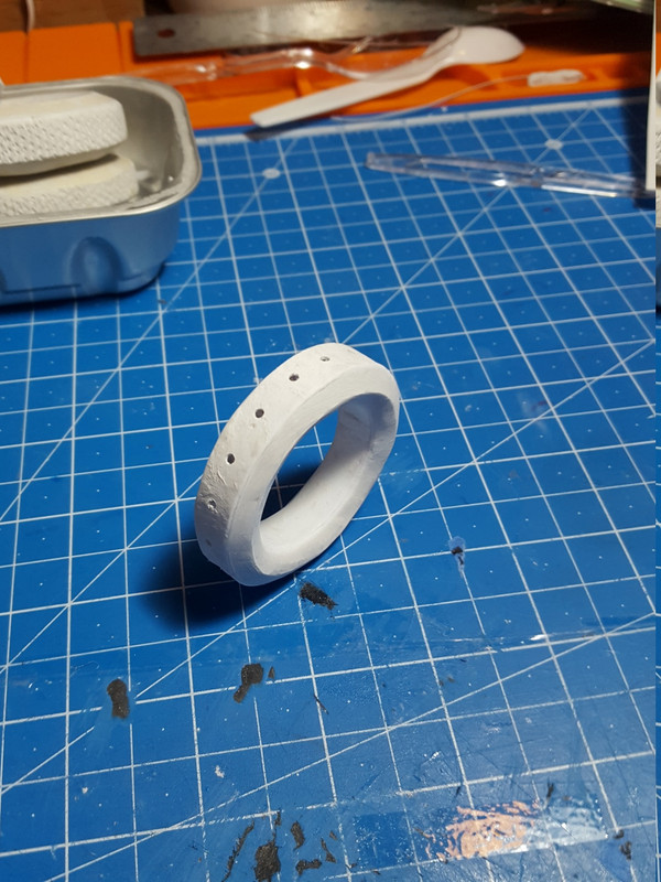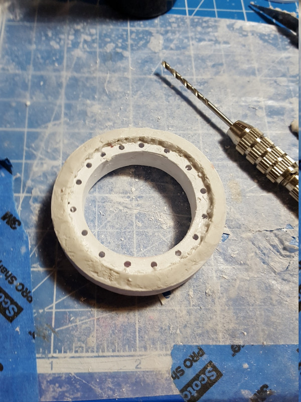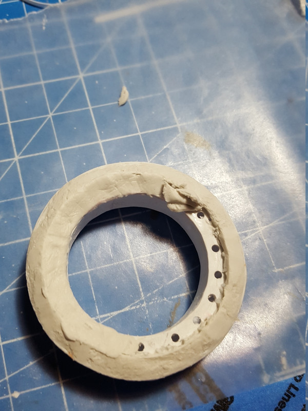 Some more work on the left front tire. This time I drilled holes where the epoxy putty goes so it pushes through the holes and makes the putty stick better to the tire. really speeds up the process.