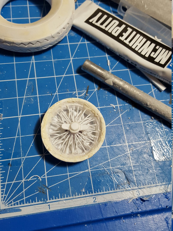 Here is the wheel with the knock off hub and putty on the outer edge to smooth that portion of the wheel down. I still need to drill 4 small holes in the wings of the knock off.